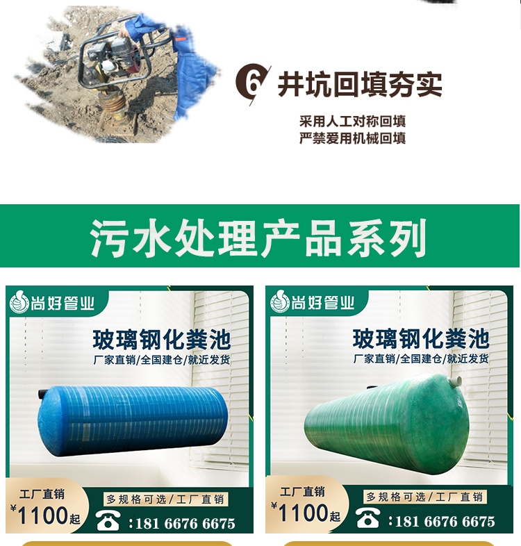 3.玻璃钢化粪池就位后,要及时回填土,罐体内灌满水,以防位移。回填土要求进行过筛,无尖角石块和建筑垃圾,无地下水时,接土质密度0.95夯实。特别注意罐体下四周用素土或黄砂填实:有地下水时,罐体下用素土或黄砂填实,罐体固定位置受力均匀。