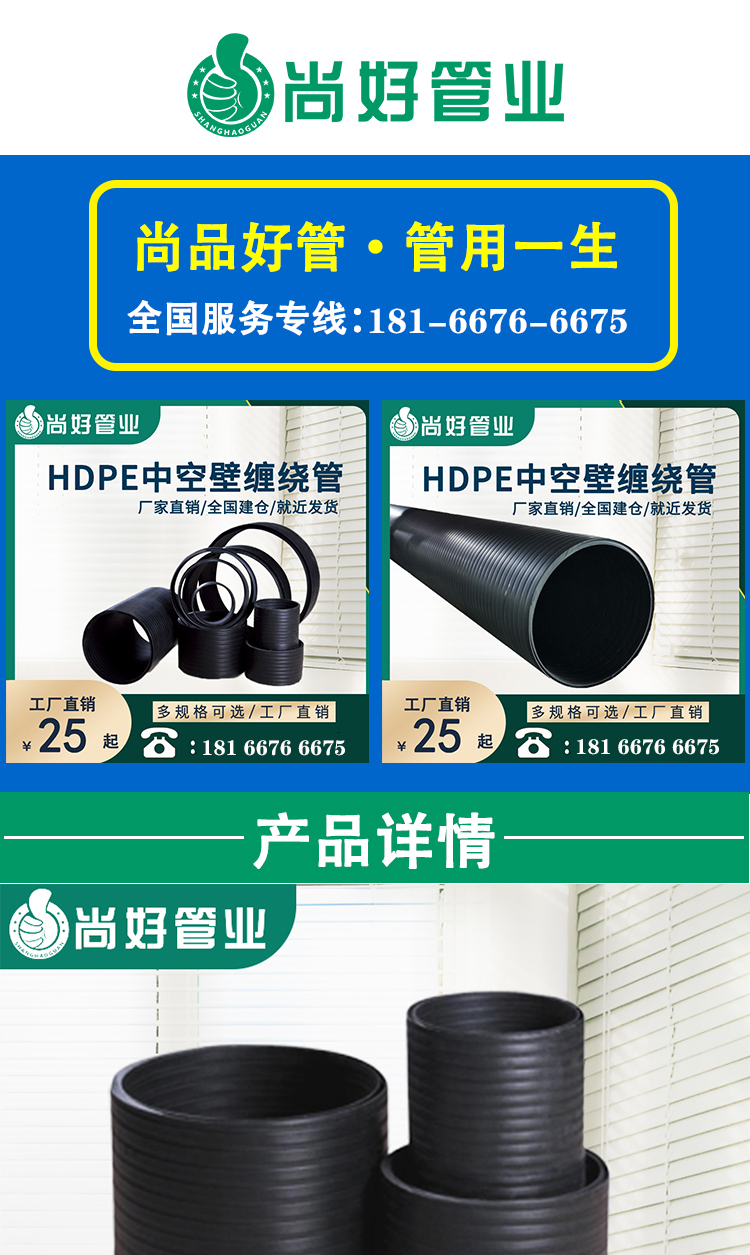 中空壁塑钢缠绕聚乙烯管道是由聚乙烯为基体,内衬高强度,可自由伸缩的“Ω”形状钢骨架为支撑结构,采用缠绕成型工艺,经加工制成内壁平直光滑,外壁呈波纹状的高品质管道,解决钢塑复合管热胀冷缩的瑕疵,产品具有耐腐蚀、重量轻、安装简便、寿命长(50)年等优点,其抗压强度是普通塑料管材的2-3倍。中空结构内衬着高强度钢骨架,有效地降低管材自身重量,大大地提高管材环刚度。